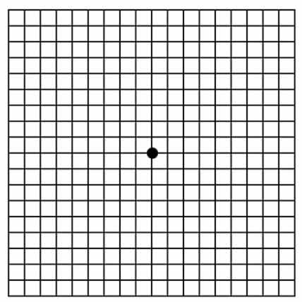 The grid consists of a pattern of vertical and horizontal lines with a dot in the center. Test each eye separately, covering the other eye. Glasses should be worn if they are normally used for reading.