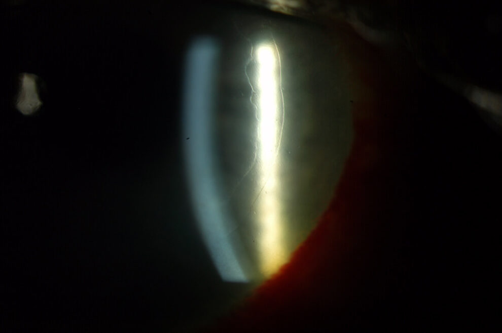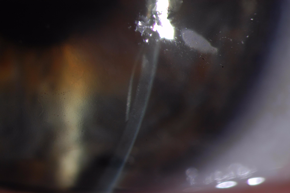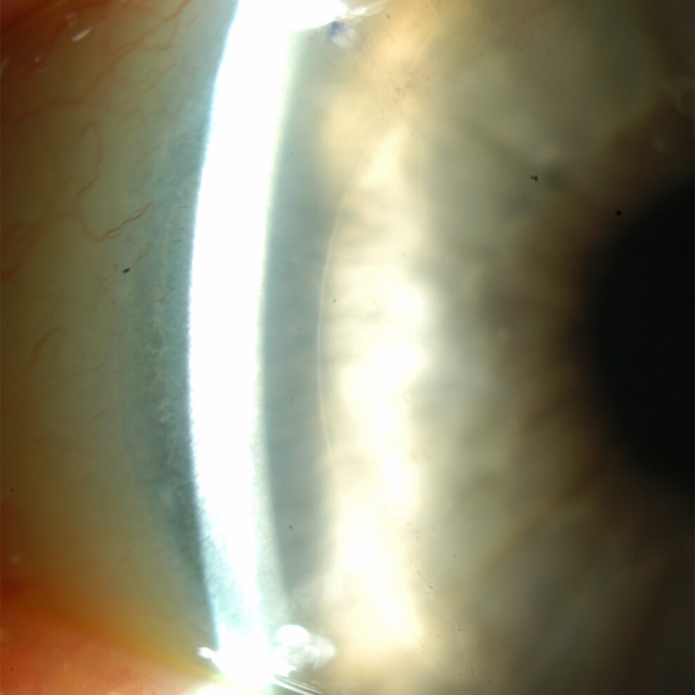 This image above was taken with an office examining scope. Special lighting techniques allow visualization of the DMEK edge.