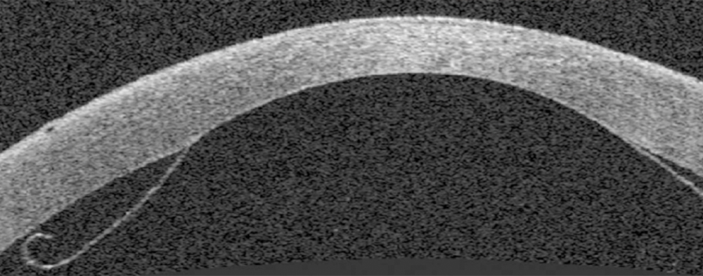 The next images show DSAEK and DMEK transplants. Notice how easy it is to see the DSAEK transplant in the eye, because it has a layer of stroma with it.  DMEK is almost impossible to see unless it is not fully attached yet.  This image of a partially separated DMEK is shown here just so that you can appreciate how thin the graft is when no stroma is transplanted.  You can see how important these grafts are to the cornea, because any area that doesn’t have the graft attached will swell thicker than other areas of the cornea.