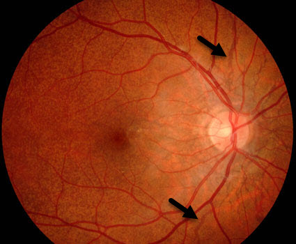 Angioid streaks (arrows) in a patient with pseudoxanthoma elasticum. The normal retinal orange color has an orange skin discoloration (peau d’orange) most evident towards the left of the picture.