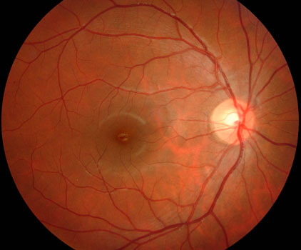 The macula is the small, specialized area of the retina that gives us our straight-ahead reading and driving vision. Angioid streaks result from an abnormal brittleness to the eyewall beneath the macula. They are often very difficult to find since they resemble the normal blood vessels that radiate out from the yellow optic nerve. The most common cause is pseudoxanthoma elasticum.