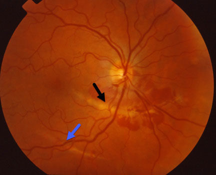 New blood vessel growth beneath the macula (macular neovascularization, MNV) can develop in some patients with choroidal ruptures. These vessels cause the macula to swell with fluid and blood and often lead to permanent central vision loss. There are many causes of MNV including angioid streaksdegenerative myopia, idiopathic, ocular histoplasmosis, and age-related macular degeneration.